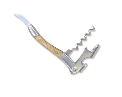 Destapador y sacacorchos en madera y acero.